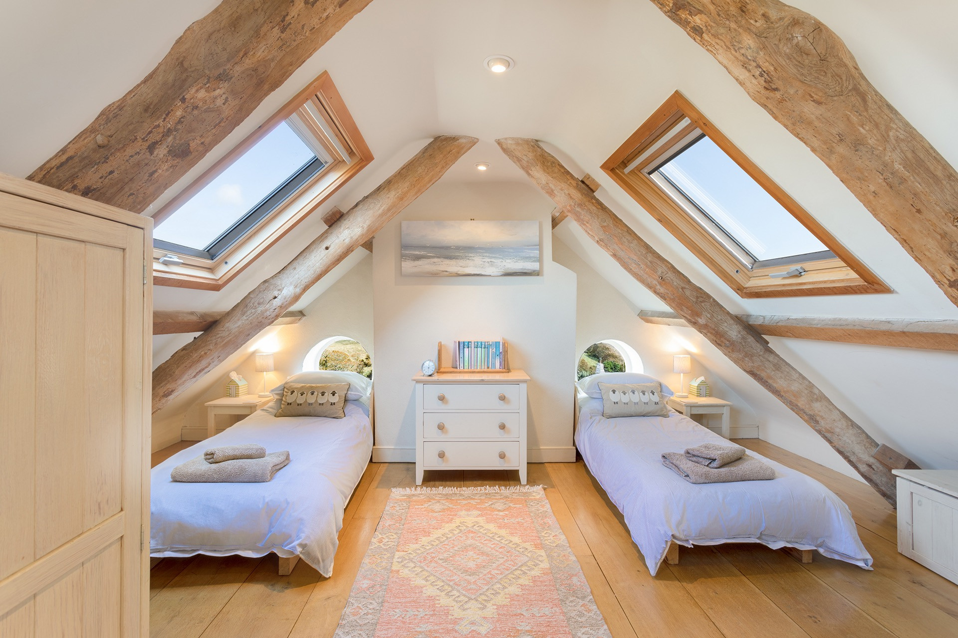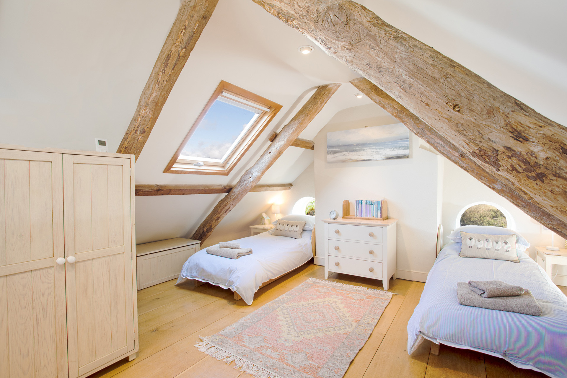 - 3 roof windows with blackout blinds, giving sea and village views