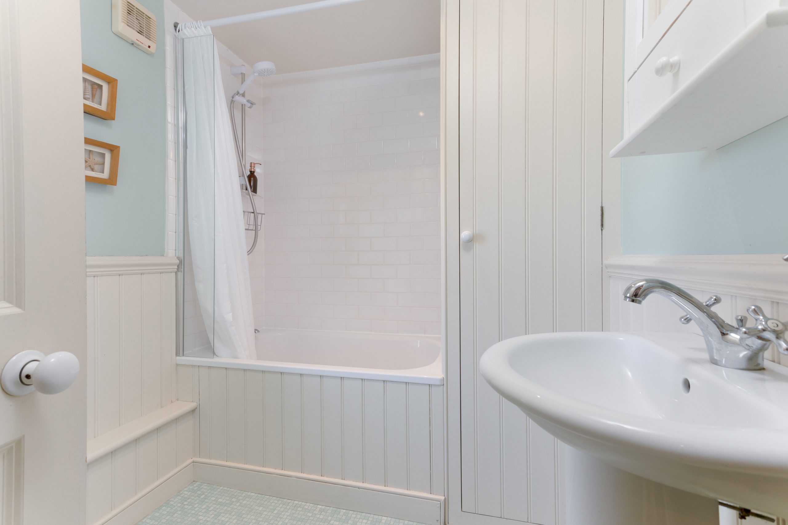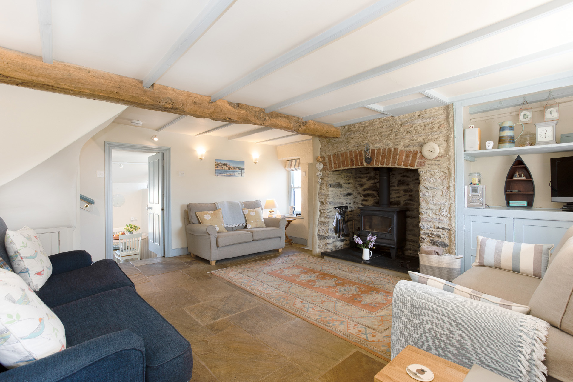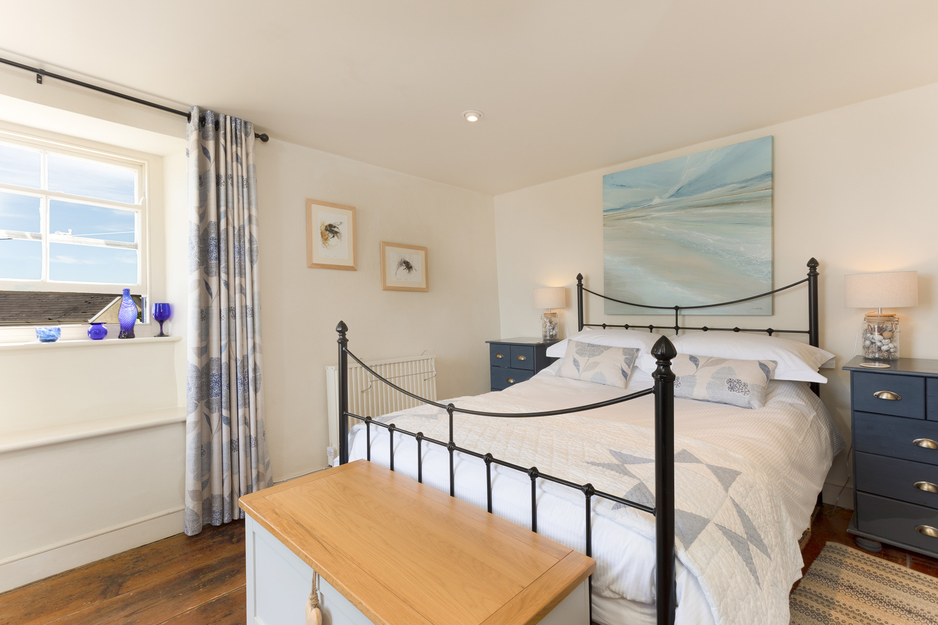 Sympathetic restoration has retained or restored original features such as the fireplace, wide wooden floorboards and sash windows. The cottage is well equipped, comfortably furnished and tastefully decorated using tranquil seaside colours and natural fabrics. Plentiful windows on three aspects ensure that Kittiwake is light and airy with excellent views over the valley to the sea. It’s cool in summer and cosy in winter, with a log burner in the sitting room and heaters in every room.